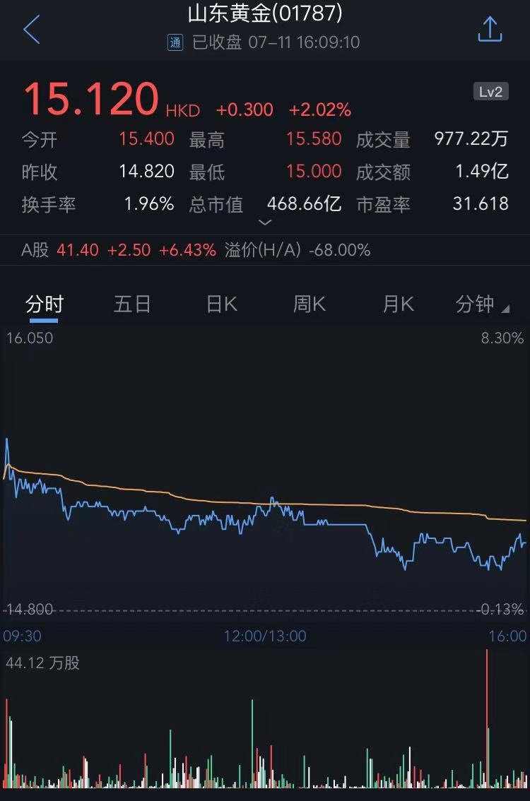 截至今日收盘,山东黄金(01787)涨2.02%,报15.12港元。