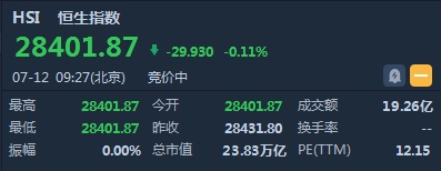 智通财经APP获悉,恒生指数开盘跌23.93点或0.11%,报28401.87点。国企指数跌0.1%,报10773.1点。红筹指数跌0.31%,报4479.75点。大市盘前成交19.26亿港元。隔夜美股三大股指涨跌不一,道指涨逾220点,历史首次收于27000点上方,纳指微跌。