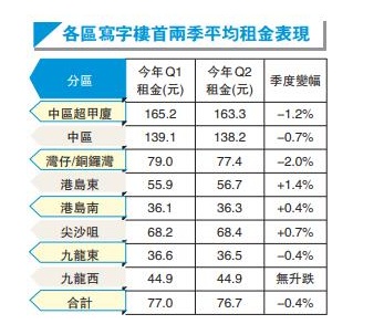 写字楼租金方面,香港整体平均租金出现5年内首度下跌。据图表显示,传统核心区,包括中区超甲级写字楼及湾仔/铜锣湾的租金的跌幅扩大,分别环比下跌1.2%及2.0%,中区租金则微跌0.7%。戴德梁行预期以上三个地区的租金将会下调1%至4%,反映出核心区租金见顶。但其他地区租金却有轻微增长,其中港岛东增幅最大高达1.4%,是港岛东、港岛南及尖沙咀三区之中增幅最大的地区。同时,保险类公司出现搬离核心商业区的情况。