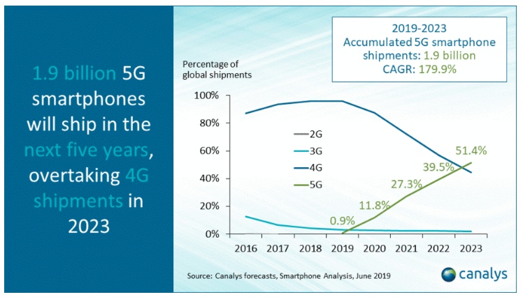 据调研机构IDC发布,2018年整体智能手机市场共计出货14.049亿台,年同比下滑4.1%。但这一趋势在2019年得到缓解,尤其是随着5G时代的到来,智能手机将迎来新一波换机潮。据市场调研公司Canalys报告显示,2023 年全球5G手机出货量将达到约8亿部,这一数字将超过4G手机,占到所有智能手机出货量的51.4%。