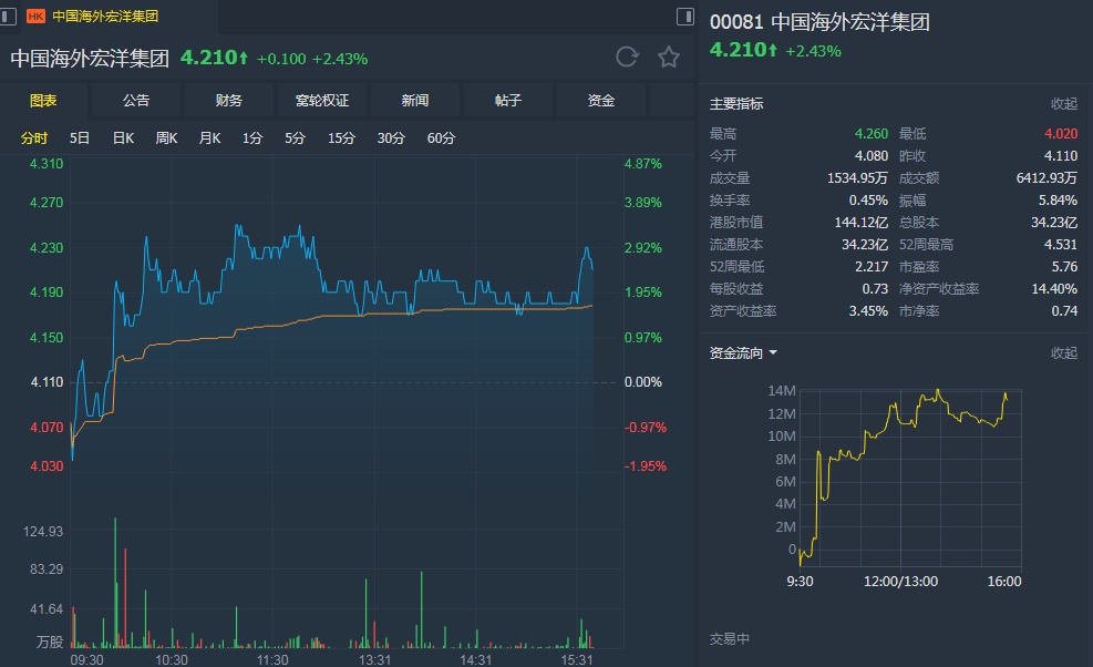 智通财经APP获悉,美银美林发表研究报告表示,中海宏洋(00081)发盈喜,因盈利扩张和收入增加,上半年纯利会升75-85%,全年盈利升幅预期会高于40%至35亿元人民币。该行将公司目标价由4.8港元升至5.3港元,以反映2019及20年的盈利调升25-30%,但被估值下调(2019/20年预测市盈率由5.8倍降至5.0倍)所部份抵销,维持其“买入”评级。