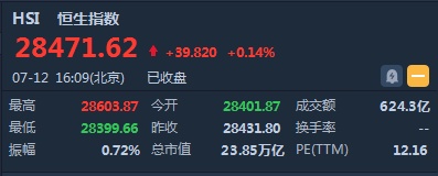智通财经APP获悉,恒指早盘低开23.93点或0.11%,报28401.87点。截至收盘,恒生指数涨39.92点或0.14%,报28471.72点,全日成交额达624.38亿。国企指数涨0.04%,报10788.34点,红筹指数跌0.83%,报4456.47点。