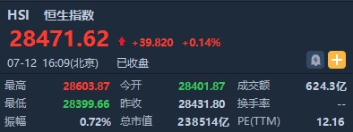 截至收盘,恒生指数涨39.82点或0.14%,报28471.62点,全日成交额达624.38亿。国企指数涨0.04%,报10788.34点,红筹指数跌0.83%,报4456.47点。