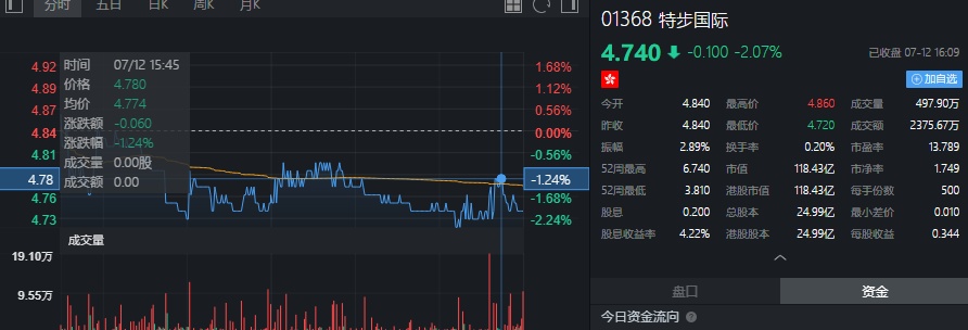 截至今日收盘,特步国际(01368)跌2.07%,报4.74港元。