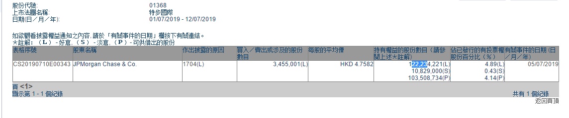 智通财经APP获悉,联交所最新资料显示,摩根大通于7月5日对特步国际(01368)减持345.5万股,每股作价4.7582港元,涉及总金额约为1644万港元。减持后摩根大通最新持股数目约为1.2亿股,最新持股比例为4.89%。