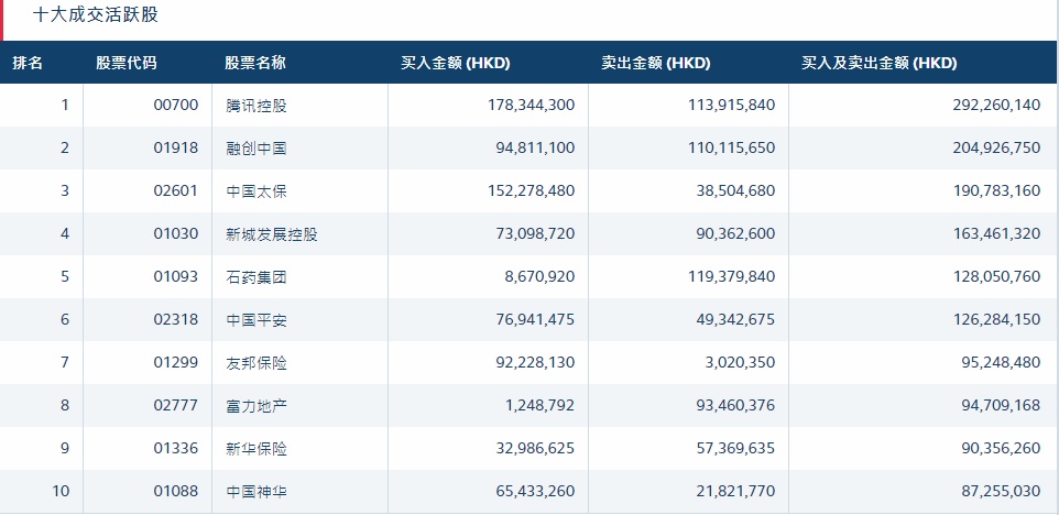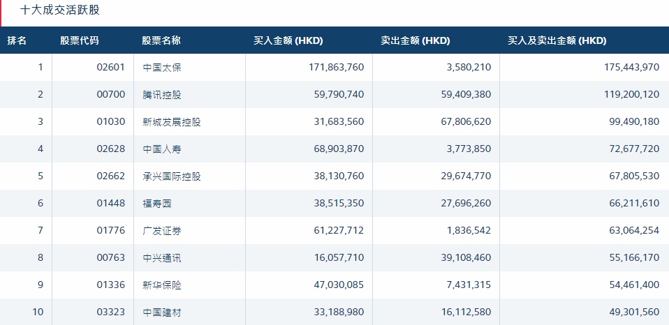 智通财经APP获悉,7月12日港股市场,北水净流入11.08亿。北水净买入最多的个股是中国太保(02601)、友邦保险(01299)、中国人寿(02628)等,净卖出最多的个股是富力地产(02777)、新城发展控股(01030)、中兴通讯(00763)等。