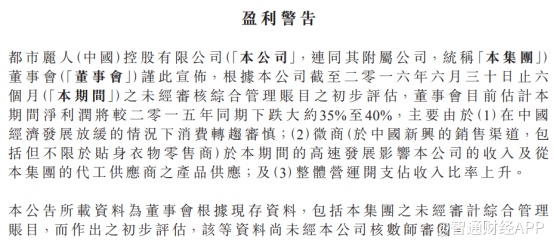 实际上,这已不是公司上市以来第一次发布盈警,智通财经APP了解到,都市丽人于2016年同期也遭遇了同样的状况。公司首先于年中发布盈警,预计上半年净利润将同比下跌35%-40%。与此同时,这一数字于年底进一步扩大,由于当年消费氛围审慎、营运开支占比大幅上升,预期净利润跌幅扩大至50%-60%。
