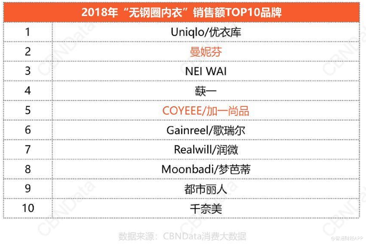 而报告中数据显示,2018年“无钢圈内衣”销售额TOP10品牌中,“优衣库,“曼尼芬”,“内外”占据了三大品牌位置。其中,后起之秀NEIWAI、蒛一均进入前五。