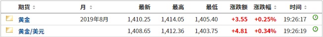 鲍威尔在国会听证会上强调,经济风险削弱了投资,通胀率远低于美联储2%的目标,美国的经济扩张可能需要一针强心剂。美联储信号使黄金再度上涨。截至发稿,黄金期货涨0.25%,报1410.25美元。