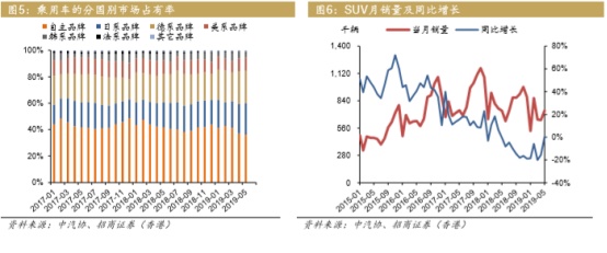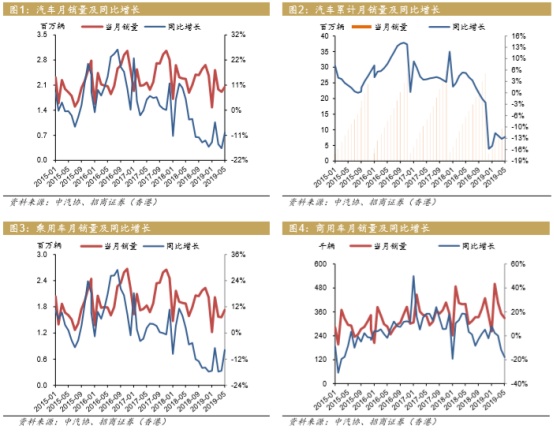 根据中汽协,6月行业销量为206万辆,同比下降9.6%,降幅环比收窄;上半 年累计销量1,232万辆,同比下降12.4%。6月降幅改善符合预期,主要由于7月1日部分地区实施国六标准,以及6月25日新能源补贴过渡期结束,刺激国 五及新能源车销量。1)车型:6月/上半年乘用车销量173万/1,013万辆,同比 下降7.8%/14%。6月轿车/MPV分别下降11%/24%,SUV增长0.3%;商用车 销量6月/上半年同比下降17.8%/4.1%,6月降幅扩大。2)库存:根据流通协 会,6月汽车经销商库存预警指数为50.4%,环比下降3.6ppt,同比下降 8.8ppt,库存预警指数位于警戒线之上。3)行业下行压力仍大:虽然终端清 库提供7月加库存空间,且同比基数低,但7月仍是行业淡季,6月销量冲刺透支7月销量,令后续动能不足,7月销量仍不乐观。行业整体改善缺乏催化 剂,预计全年销量下滑5%以上,维持行业“中性”评级。