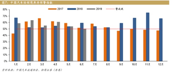 根据中国汽车流通协会数据,六月份经销商库存预警指数为50.4%(前值54%),同比下降8.8ppt,环比下降3.6ppt,库存预警指数位于50%的警戒线之上。