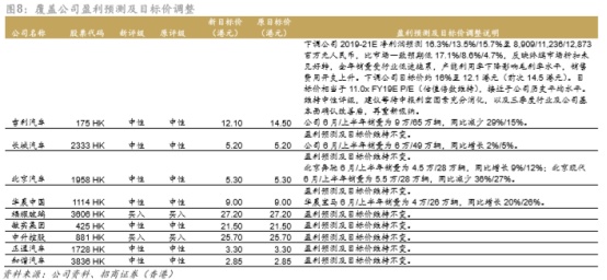 六月批发数据跌幅收窄,终端销售恢复正增长,是以惨烈降价促销为代价,数据短暂回暖仍不足以支撑行业复苏的判断。我们渠道调研显示,大部分切换到 国六的新车型的折扣并未显著改善(部分折扣收窄可能是排放成本上升所致),因而目前市场需求未真正回暖,仍需耐心等待转机。我们下调吉利汽车 (00175)目标价约16%至12.1港元(前次14.5港元,详见第3页图8)。投 资策略:1)豪华车产业链受益于限购城市放宽牌照及消费升级,首推豪华车经销商中升控股(00881,买入),公司销售的奔驰、雷克萨斯及日系汽车强 劲增长;2)等市场稳定后再考虑盈利弹性大的自主品牌制造商;3)行业低迷或倒逼刺激消费政策持续加码,把握自主品牌的交易性机会。