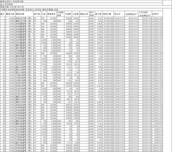 7月12日,港交所公布发行未上市共计62只界内证,其中,50只界内证将于7月18日(下周四)正式在香港交易所上市,12只在7月19日上市。以下是50只未上市界内证。