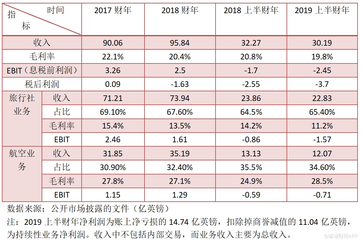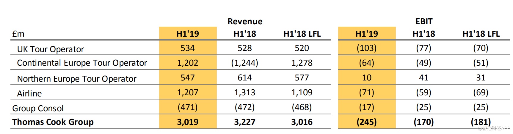 旅行社业务包括英国旅行社、欧洲大陆旅行社以及北欧旅行社,其中北欧的EBIT在2018及2019上半财年均实现正数,不过受其他两家旅行社亏损拖累,整体的的EBIT分别为-0.86亿英镑和-1.57英镑,拉低了整体的EBIT值。