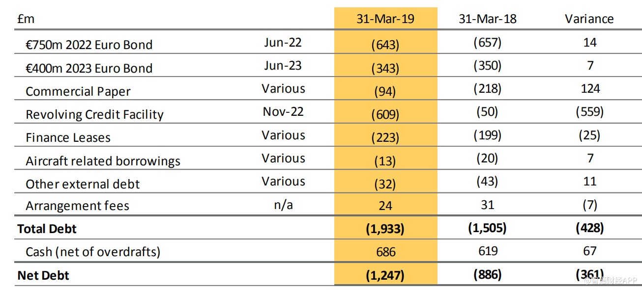 2018财年,该公司的资产负债率达95.6%(2017财年为96.1%),流动比率0.5倍,净流动负债-21.09亿英镑(2017财年为-21.08亿英镑),而2019上半财年总有息负债19.33亿英镑,净负债-12.47亿英镑,债务压力非常大。