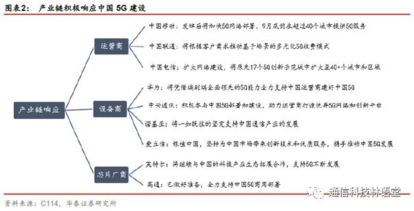 产业链聚力,共同推进我国5G商用进程。监管方面,工信部部长苗圩强调,5G牌照发放后,我们一如既往地欢迎外资企业积极参与我国5G市场,共谋我国5G发展,分享我国5G发展成果。产业链方面,包括三大运营商和广电在内的网络建设方和华为、中兴、爱立信、高通等供应商纷纷表示支持我国5G商用部署,共同推进我国5G商用进程。