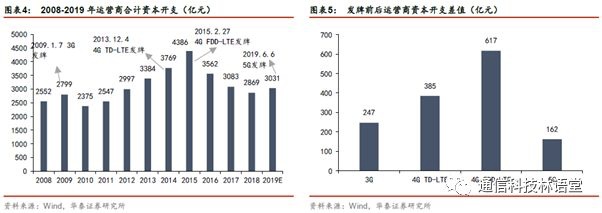 回溯历史发牌当年资本开支皆同比增长明显,运营商加大资本开支或将在网络建设提速下提升。回溯历史,我国3G牌照正式发放于2009年1月;4G牌照分两次发放,2013年12月发放TD-LTE牌照,2015年2月发放FDD-LTE牌照。不管是同时发放还是分次发放,运营商的资本开支投入与牌照正式发放息息相关。对比牌照发放前后运营商CAPEX支出:3G牌照发放后,三大运营商2009年合计CAPEX相比2018年增加了247亿元;4G TD-LTE牌照发放后,2014年CAPEX支出比2013年增加385亿元;4G FDD-LTE牌照发放后,2015年增加617亿元。5G牌照发放时间处在年中时点,运营商资本开支计划已定,2019年资本开支计划合计为3031亿元(其中中国移动取计划上限1671亿元),比2018年支出增加仅仅162亿元。我们认为在5G牌照发放加速的背景下,运营商网络建设进度和规模有望提升和扩大,运营商实际资本开支或将高于年初规划。