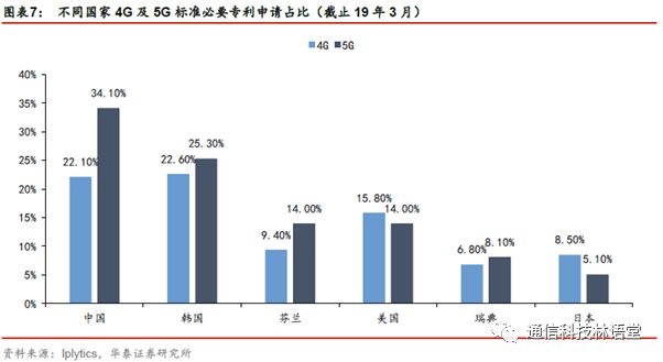 中国5G商用与全球同步,国内5G投资高峰周期或长于4G。3G标准由国际电信联盟ITU在2000年确定,全国范围内日本在2001年率先发牌商用,2004年欧洲各国开始商用,而我国在2009年才向三大运营商正式发放3G牌照,比日本晚了将近8年时间。4G整体标准由3GPP牵头,并确定了有TD-LTE以及FDD-LTE两个标准,标准的确定在2010年12月完成。日本和欧洲国家于2010年相继发牌商用,美国2011年开始商用,而我国于2013年12月发放TD-LTE牌照,2014年下半年正式商用。4G网络商用相对日本和欧洲国家晚了大概3年。对比3G/4G时期,国外先行商用,产业整体成熟后我国直接投资商用,5G时期我国全球引领行业应用,根据德国Iplytics公司数据显示,截止2019年3月份,我国5G专利数量约占34%的比例,全球第一,并且与4G时期的22%相比有了大幅提升,展现出我国在5G从研发到技术专利的领先优势。我国作为5G商用领先国家,产业建设需要自身不断摸索和验证,我们预计相应投资高峰的周期将长于4G时期(4G投资高峰为2014年和2015年)。中国移动董事长杨杰也曾表示预计2020年至2022年是5G的投资高峰期。