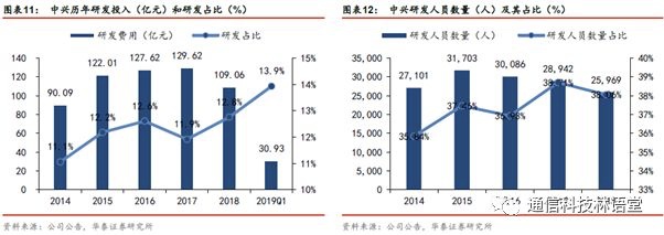 持续研发投入,铸就竞争壁垒。公司每年的研发投入都维持在较高的水平,自2014年开始,研发投入金额不断提升,研发投入占总收入比例始终保持在10%以上,2014年至今累计研发投入超过600亿元。中兴通讯作为5G重要推动者之一,一直重视5G 关键技术和产品的研发,致力于5G 赋能垂直行业的创新,2018年公司研发投入109.1亿元,占营业收入的12.8%;2019年第一季度,研发投入为30.93亿元人民币,占营业收入比例为13.9%,占比较上年同期的9.8%上升4.1个百分点,我们预计2019全年研发投入占比依旧维持在较高水平。此外,中兴在中国、美国、瑞典等地设立了20个研发中心,107个分支机构,与领先运营商成立的10+个联合创新中心。2018年公司员工数量达到6.8万人,其中研发人员为2.6万人,研发人员占比约为38%。
