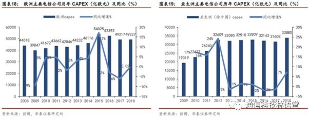 我们整理了欧洲主要电信运营商(包括德国电信、沃达丰、西班牙电信、orange等17家公司)、亚太洲主要电信运营商(包括日本、韩国、新加坡、马来西亚等20家公司)近几年的资本开支情况,数据显示2018年欧洲合计CAPEX支出为49227亿欧元,同比上涨0.02%;亚太洲(除中国)2018年CAPEX支出为33880亿欧元,同比增长约7%,表明贸易摩擦之下,欧洲和亚太洲地区网络建设需求依旧。