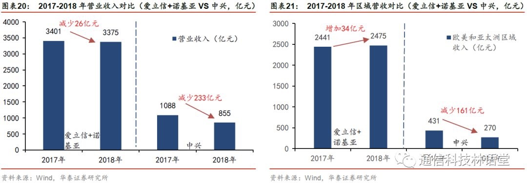 受销售禁令影响,中兴2018年业绩受到较大冲击,然而对比爱立信和诺基亚的同期业绩,二者并没有因中兴订单收缩而大幅受益。从营业总收入看,2018年实现营业总收入855亿元,较2017年减少了233亿元,爱立信和诺基亚2018年合计收入为3375亿元,同比减少了26亿元;分区域收入看,中兴海外业务影响较大的主要是欧美和亚太洲,2018年中兴欧美洲和亚太洲合计实现收入270亿元,同比减少了161亿元,而爱立信和诺基亚相应区域实现2475亿元,较同期仅仅增长了34亿元。可见2018年在中兴订单收缩的情况下,运营商订单并未直接转移给诺基亚和爱立信从而大幅受益。主要原因可能在于:诺基亚与收购的阿尔卡特朗讯进行技术整合,5G技术和设备方面略显迟缓;而爱立信因为缩减成本、精简人员架构、收购重组等业务调整发展略显缓慢。