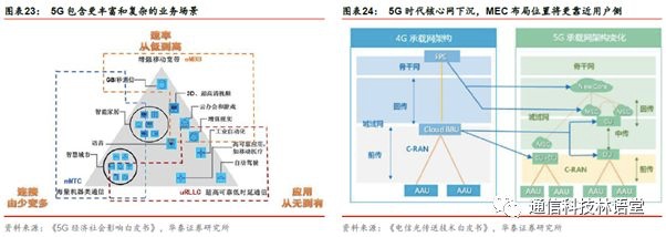 5G高宽带低时延的场景需求驱动边缘计算发展。5G 相比于4G 具有更为丰富的应用场景,5G 的三大应用场景:增强型移动宽带eMBB、大规模机器通信mMTC和超可靠低时延通信uRLLC,新的业务场景的需求变化对网络架构提出了更高的要求,SDN和EMC等新兴技术应用而生。5G网络架构包括接入云、控制云和转发云三个域。4G时代核心网(EPC,演进型分组核心网)部署位置较高,为了满足5G低时延业务需求,5G核心网被拆分成New Core和MEC(移动边缘计算)。MEC 将数据缓存能力、流量转发能力与应用服务能力进行下沉,网络位置将更接近用户,能够大幅降低业务时延,满足车联网、工业互联网等低时延业务需求,减少对传输网的带宽压力,降低传输成本;支持高清视频、AR/VR 等高带宽业务的需求,并进一步提高内容分发效率,提升用户体验。MEC等新兴技术的出现逐渐打破了传统CT行业和IT行业的边界并逐渐走向融合,有望产生一个新的蓝海市场。