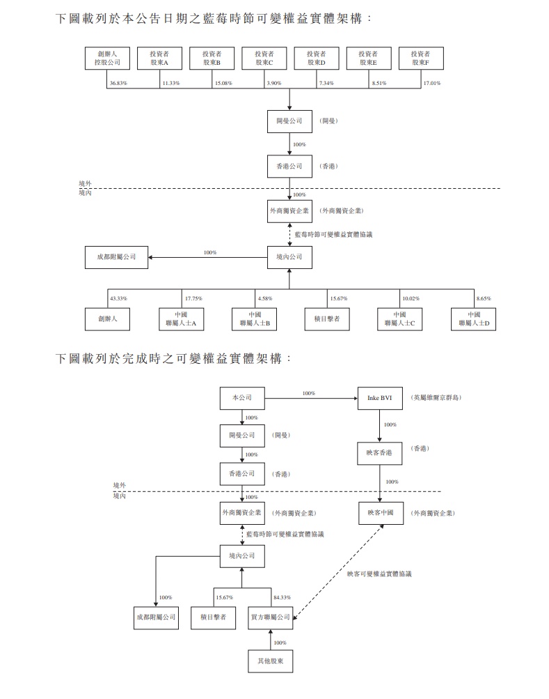公告显示,该开曼公司为Social Network Technology Co., Ltd。香港公司为Socialmaker Technology Limited。境内公司为北京蓝莓时节科技有限公司。外商独资企业为蓝莓时节文化(北京)有限公司,开曼公司间接拥有外商独资企业全部股权。成都附属公司为成都蓝莓时节科技有限公司,为境内公司的全资附属。