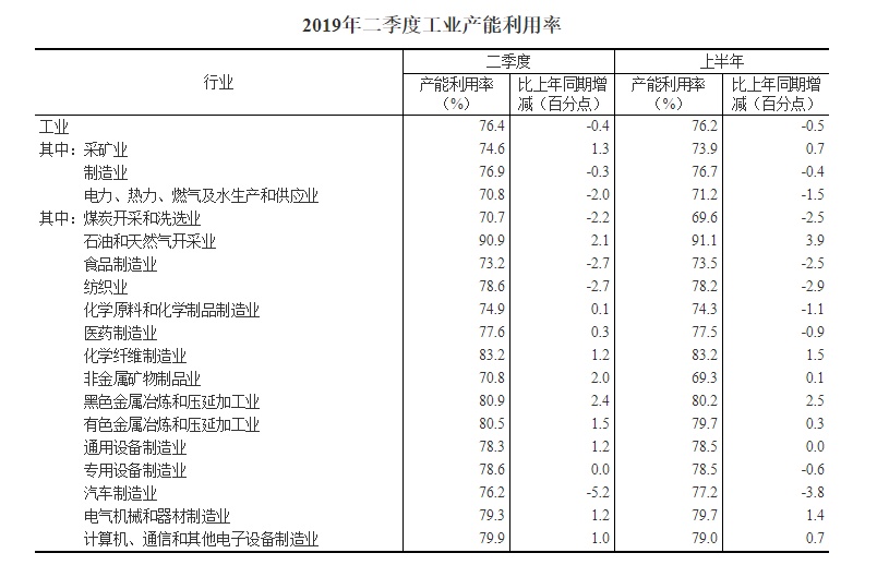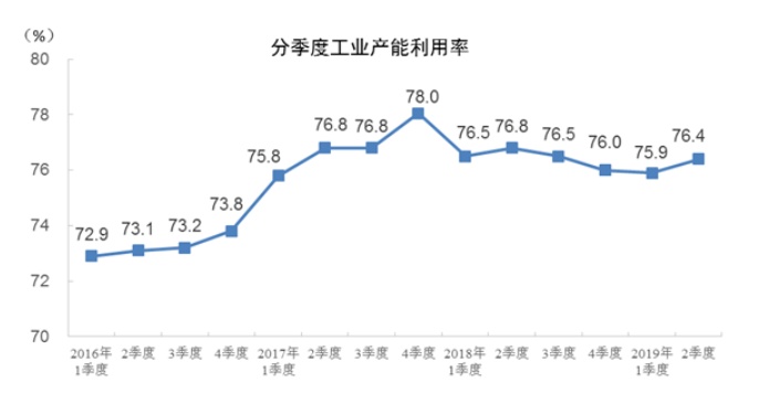 智通财经APP获悉,7月15日,国家统计局数据显示,2019年二季度,全国工业产能利用率为76.4%,比上年同期下降0.4个百分点,比一季度上升0.5个百分点。上半年累计,全国工业产能利用率为76.2%,比上年同期下降0.5个百分点。