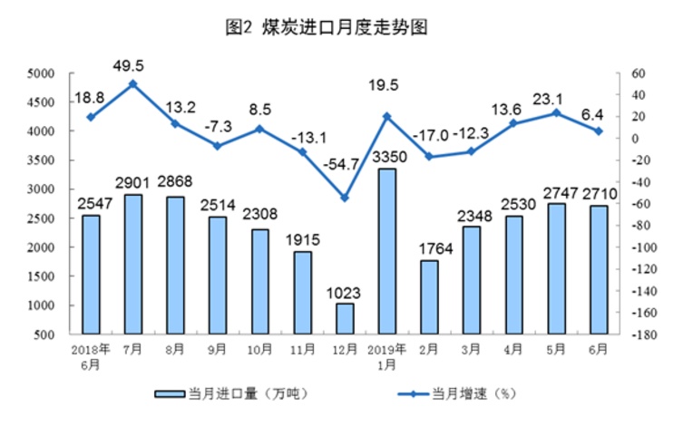 6月份,进口煤炭2710万吨,同比增长6.4%;上半年进口煤炭1.54亿吨,同比增长5.8%,一季度为下降1.8%。