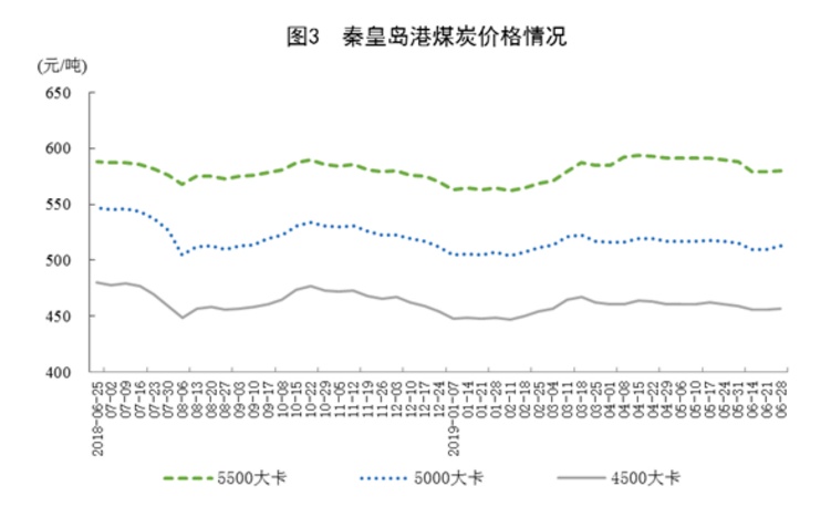 煤炭价格小幅下跌。6月28日,秦皇岛5500大卡煤炭综合交易价格为每吨580元,5000大卡为每吨513元,4500大卡为每吨457元,比5月31日分别下跌8元、2元和2元。