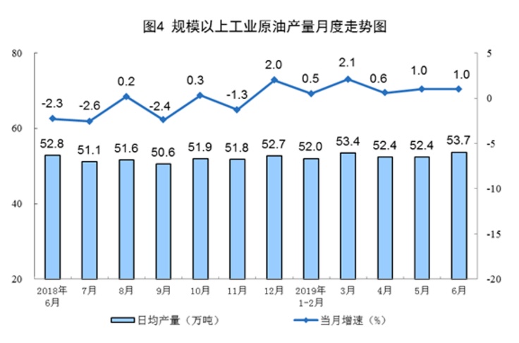 6月份,生产原油1610万吨,同比增长1.0%,增速与上月持平;日均产量53.7万吨,比上月增加1.3万吨。上半年,生产原油9539万吨,同比增长0.8%,增速比一季度加快0.2个百分点。