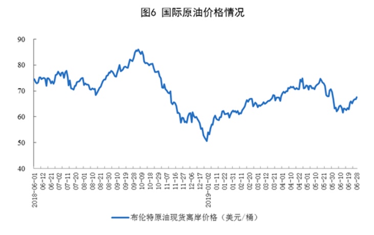 国际原油价格有所上涨。6月28日,布伦特原油现货离岸价格为67.5美元/桶,比5月31日上涨0.7美元。
