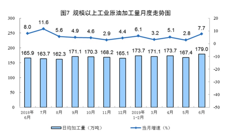 6月份,加工原油5370万吨,同比增长7.7%,增速比上月加快4.9个百分点;日均加工179.0万吨,比上月增加11.6万吨。上半年,加工原油31697万吨,同比增长5.8%。