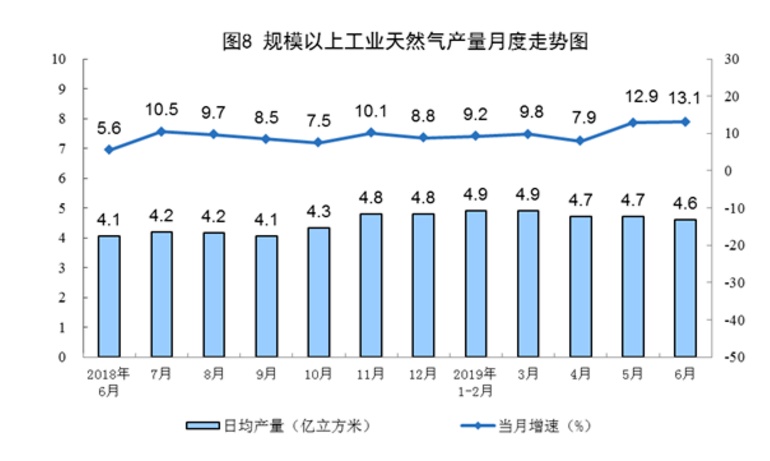 6月份,生产天然气139亿立方米,同比增长13.1%,增速比上月加快0.2个百分点;日均产量4.6亿立方米,比上月减少0.1亿立方米。上半年,生产天然气864亿立方米,同比增长10.3%,增速比一季度加快0.9个百分点。