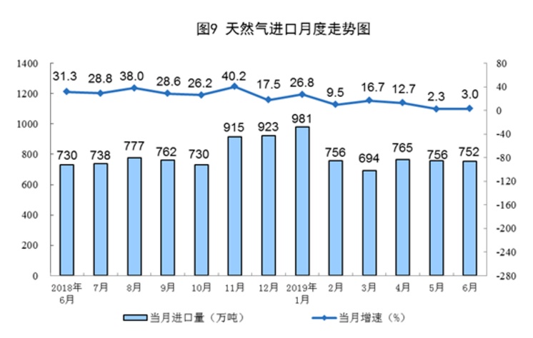6月份,进口天然气752万吨,同比增长3.0%;上半年,进口天然气4692万吨,同比增长11.6%,增速比一季度回落6.2个百分点。