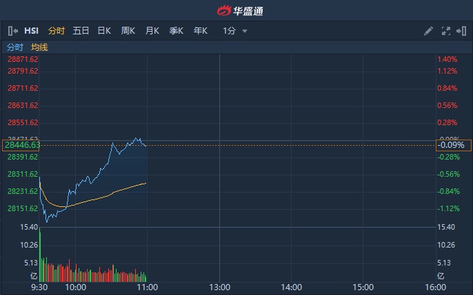 智通财经APP获悉,恒指早盘低开0.59%后继续下挫,跌幅一度扩大至1.34%,跌超300点,下试30日线后迅速反弹拉升,并成功翻红。截至10时54分,涨0.031%,报28480.45点。