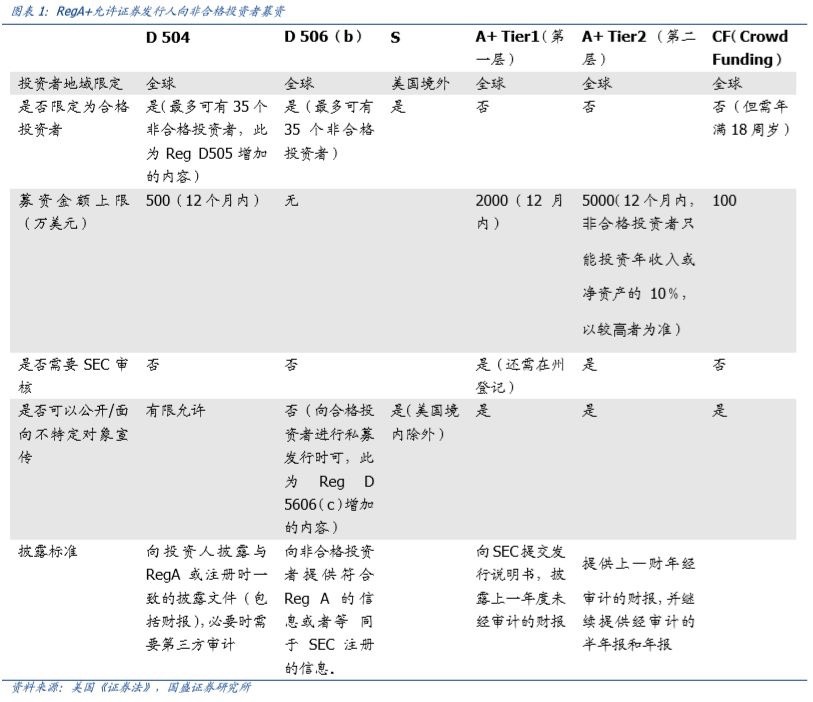 Reg A+时是2015年3月25日根据《工商初创企业促进法案》(即“JOBS法案”)对Reg A的补充,它将Reg A分成12个月内募资上限分别为2000万美元和5000万美元两个层级的融资。Reg A+允许发行人向非合格投资者公开募资。此处的合格投资者指的是满足以下条件的投资者:至少有100万美元净资产,或者最近两年有至少20万美元的个人年收入或30万美元的家庭年收入。