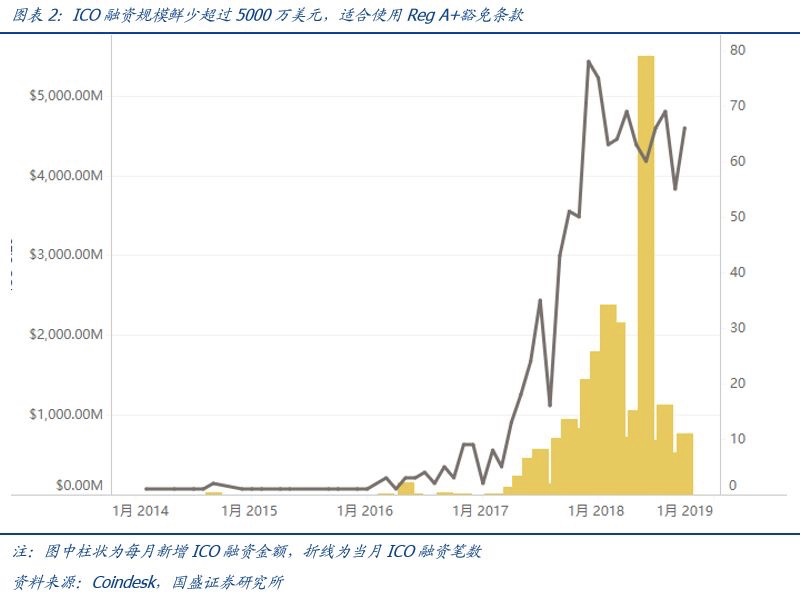 Reg A+或成区块链代币上市标配。SEC表示,除比特币和以太坊外的绝大多数区块链代币皆为证券。根据美国1933年颁布的《证券法》,发行证券需在SEC注册,除非根据D、S、A等条例(即“Reg D”、”Reg S”、“Reg A”)获得豁免。在相当长的一段时期内,区块链代币没有在SEC成功注册发行或豁免的先例。