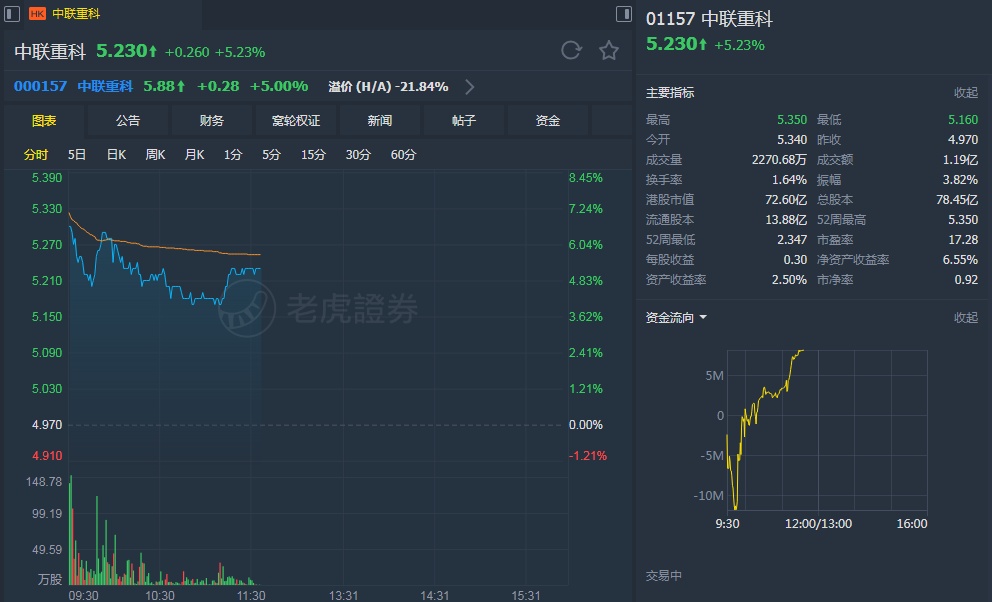 智通财经APP获悉,里昂发表报告指出,中联重科(01157)发盈喜,预计今年上半年纯利介乎24亿元至27亿元人民币,第二季录171%至212%的年增长,对比首季为年增长166%。该行表示,需求强劲、毛利扩张、成本节省及正面的经营槓杆为推动集团表现的四个动力,预计在地方政府基建债券的强劲部署下,有关动力将在下半年持续。该行上调对中联重科今明两年盈利预测分别55%及56%,预料其年增长分别124%及17%,目标价由5.88港元上调至6.98港元,相当于明年预测市盈率12倍,并维持“买入”评级,并继续为内地机械行业的首选。