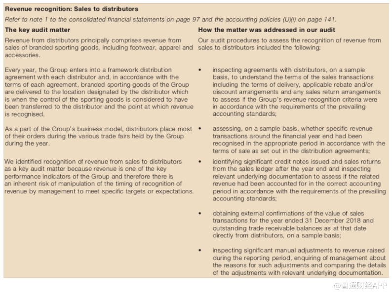 下面是安踏2018年年报的内容。安踏列出了审计人员审核分销商收入确认的方法:a)评估分销商协议(由安踏提供),b)评估安踏的账户是否以经销商协议提供的方式反映收入(安踏提供的信息),c)审查信贷票据和退货的文件(由安踏提供),d)发送确认信到分销商(其金融部门安踏控制)和e)向管理层询问(欺诈的策划者)重大销售调整。