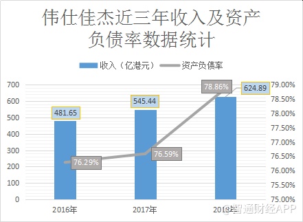 2016年时,伟仕佳杰收入为481.65亿港元,资产负债率76.29%。2018年时,收入增至624.89亿港元,资产负债率上升至78.86%。