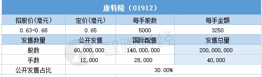 智通财经APP获悉,7月15日,康特隆(01912)配售结束。配售招股价区间为0.63-0.68港元,最终定价0.65港元,每手3250港元。