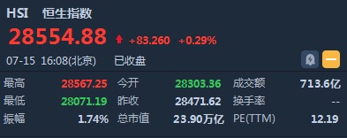 智通财经APP获悉,恒指早盘跌168.26点或0.59%,报28303.36点。截至收盘,恒生指数涨83.26点或0.29%,报28554.88点,全日成交额达713.69亿。国企指数涨0.47%,报10838.99点,红筹指数涨0.18%,报4464.68点。