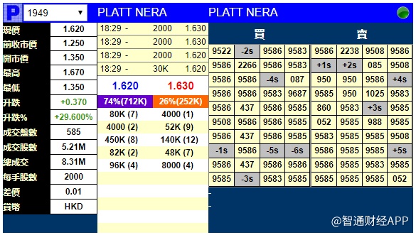 智通财经APP获悉,Platt Nera International Limited(01949)将于7月16日挂牌,上市前夕,辉立证券暗盘交易显示其收报1.62港元,较招股价1.25港元涨29.6%。每手2000股,不计手续费,每手赚740港元。
