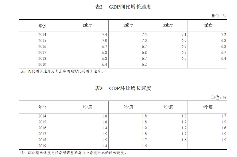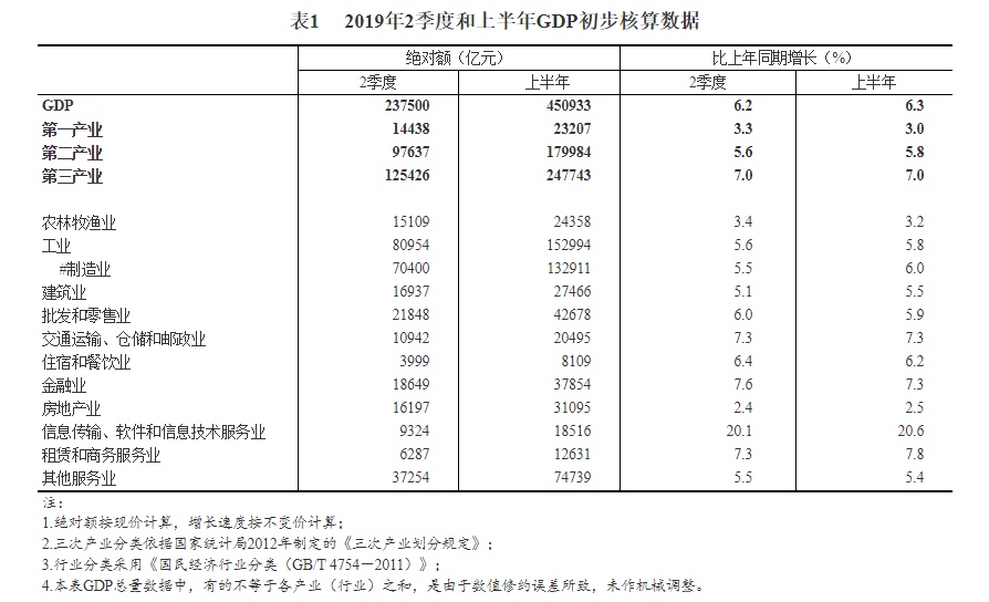 智通财经APP获悉,国家统计局公布了2019年上半年国民经济运行数据。经初步核算,今年上半年我国国内生产总值450933亿元,按可比价格计算,同比增长6.3%。其中,一季度同比增长6.4%,二季度增长6.2%。