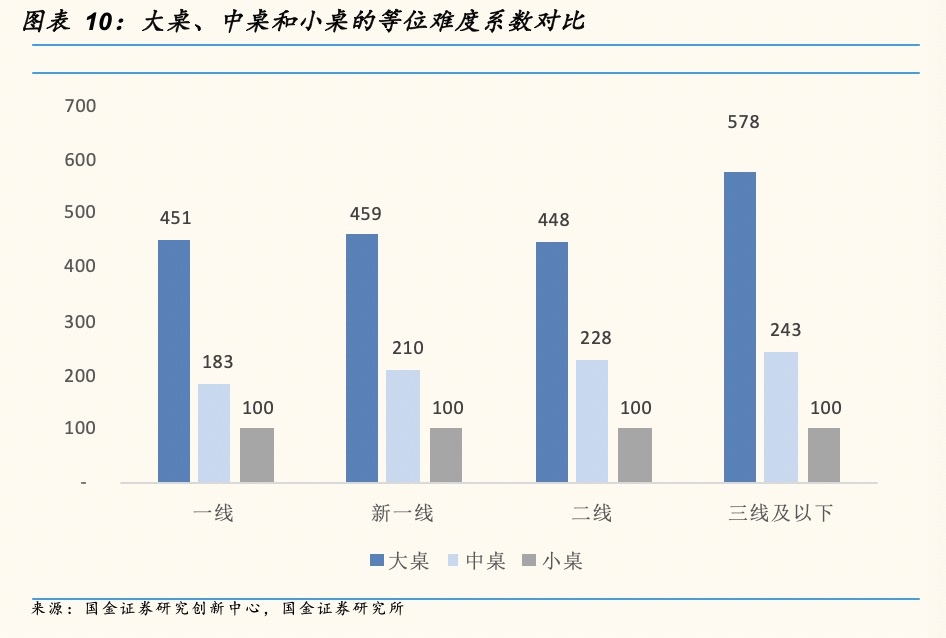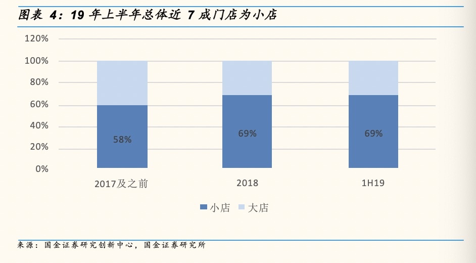 此外,我们注意到一个明显的趋势是,不管是高线城市还是低线城市,新开店的门店面积逐渐变小。从国金研究创新中心跟踪的数据来看,最小的门店面积约400平米,大店则最大面积超过2000平米。我们以面积900平米作为划分小店和大店的依据进行统计。结果显示,2018年以及19年上半年开出的门店中,小店占比接近7成。根据我们草根调研的信息,小型门店平均容纳桌位数在65张左右,大型店平均容纳85张桌子。在实际运营中,不同门店会按照周边客流量情况和消费群结构,合理配置大、中、小桌的比例,但总的来说我们认为单店面积和平均单店桌位数总体呈下降趋势。