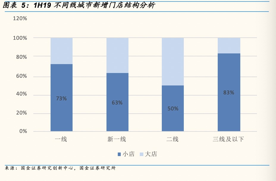 从不同城市的门店配置来看,今年上半年除了二线城市新店里小店、大店占比各一半外,其他城市均是小店占比居多。尤其是低线城市的新店中,小型门店超过8成。