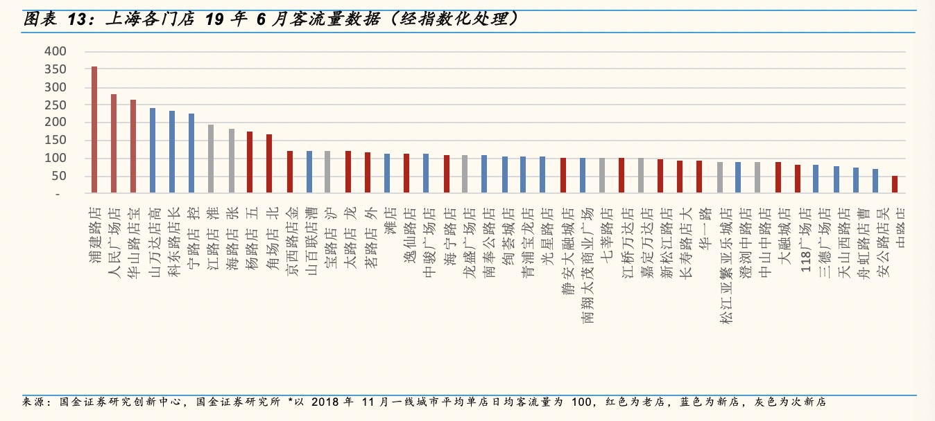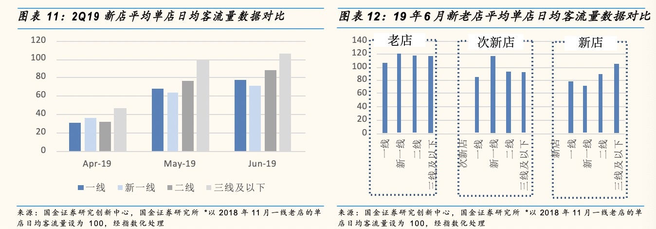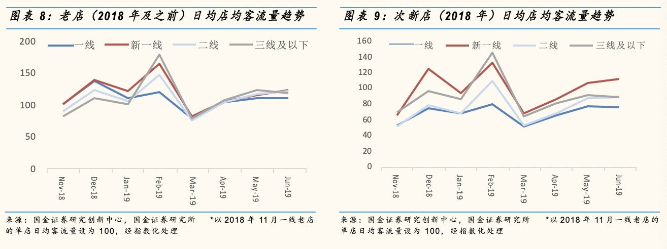 我们将18年之前开的门店定义为老店(按国金统计口径241家),2018 年新开的门店定义为次新店(按国金统计口径172家),19年新开的门店定义为新店(按国金统计口径117家)。我们以2018年11月一线老店的单店日均客流量设为100,经指数化处理,来观察19年上半年不同线城市老店、次新店的客流量变化。