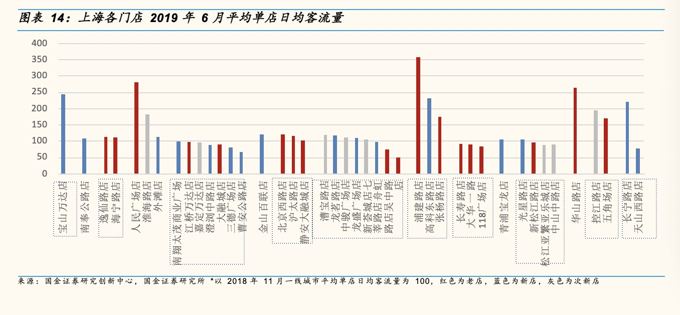 我们也比较了新店的客流量情况。我们认为三线及以下城市,由于新进城市较多,多位于核心商圈,因此低线城市的新店以拉新为主,新店客流量数据也是所有城市新店中表现最好的。但从一二线城市来看,由于老店占据了最佳的商圈位臵,所以新增的门店(次新店、新店)均很难达到老店的客流量水平。