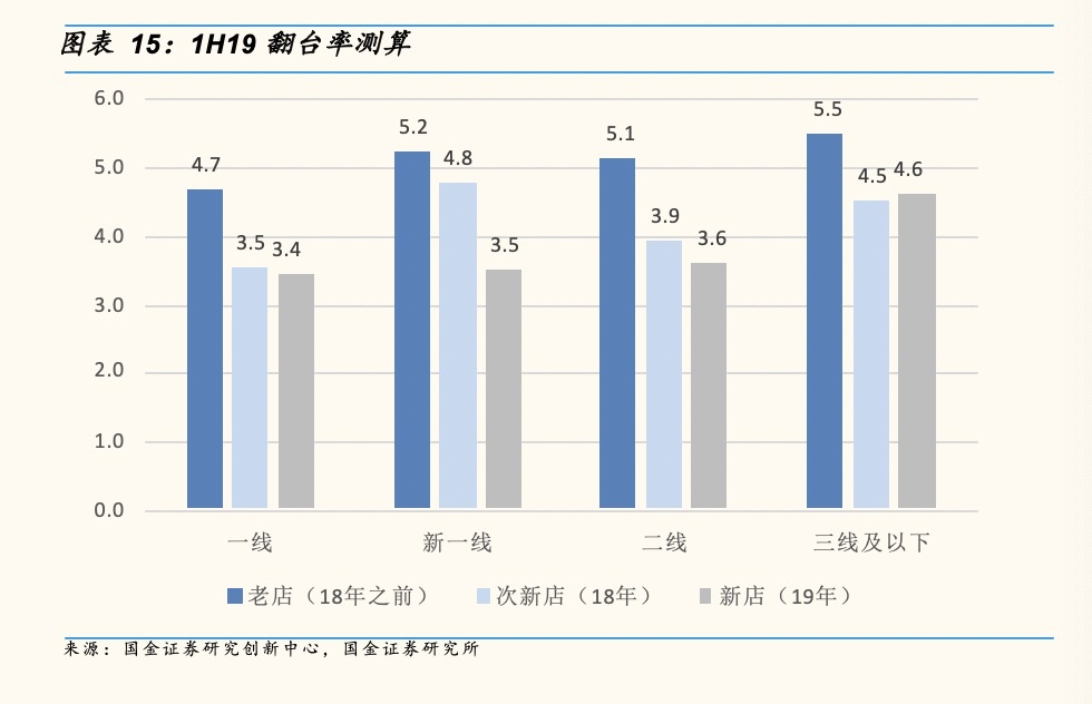 一线城市客流量出现分化。从我们跟踪的客流量数据来看,一线城市由于门店网络扩张明显,拉新的边际效应在降低,1H19期间单店客流量表现开始分化。处于核心商圈的老店凭借选址优势,翻台率长期处于高位;但在某些城市部分门店密度较高的区域中,已经出现老店客流量低于新店的情况。